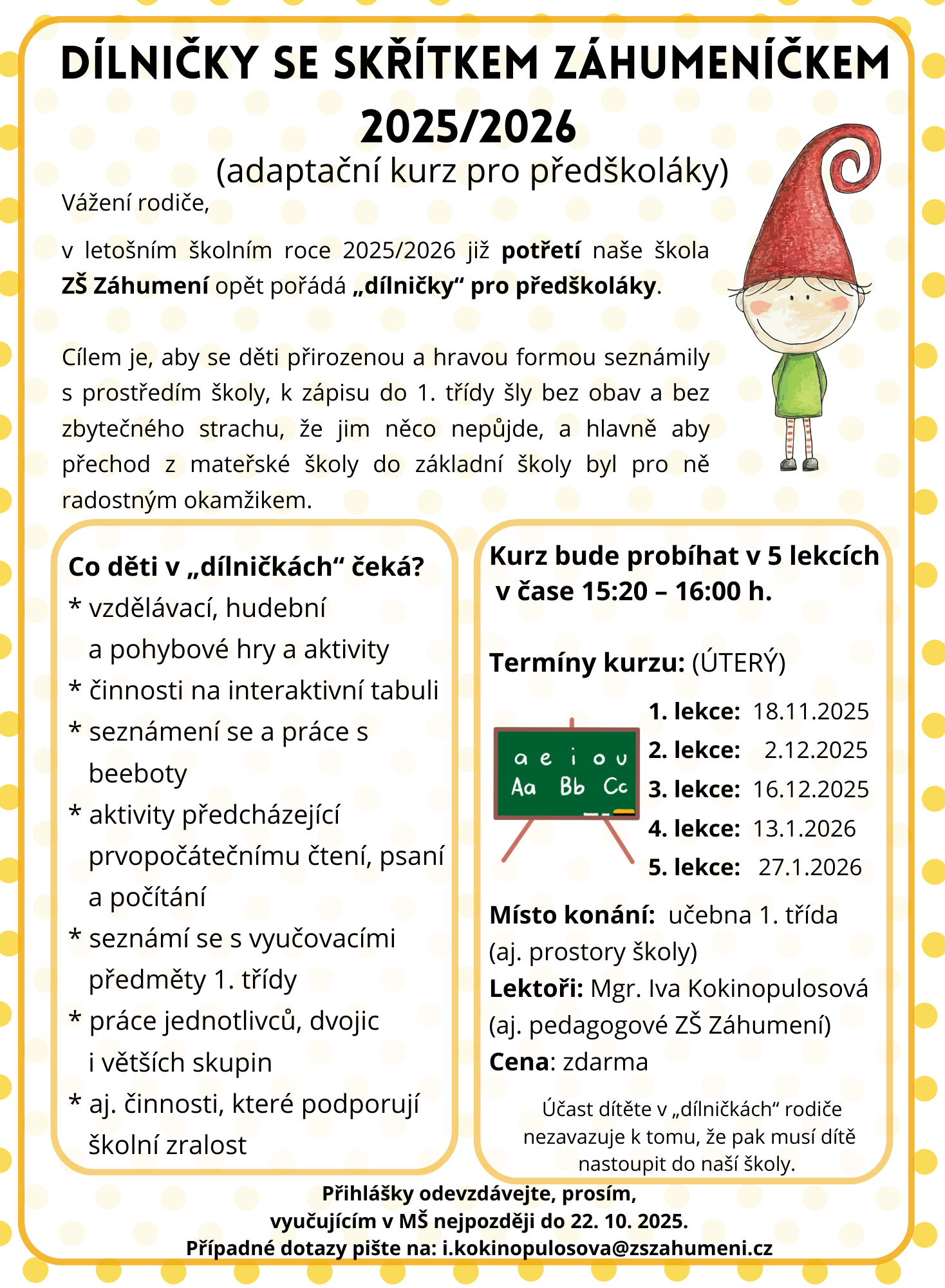 i v letošním školním roce bychom chtěli pozvat všechny předškoláky na Dílničky se skřítkem Záhumeníčem, které jsou na naší škole tradicí již třetím rokem. Přihlášení je zdarma a slouží k adaptaci a seznámení se předškoláků se školním prostředím hravou formou. Budoucí prvňáčci tak zjistí, že i ve škole mohou zažít plno legrace.